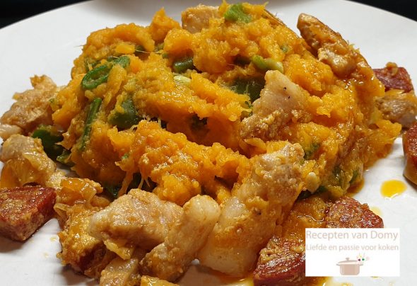 Verwarm in een koekenpan de margarine en bak de spekjes samen met de uien en de Chorizo worst.