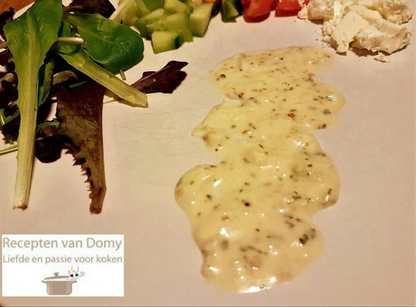 Eventueel voeg er wat peterselie of bieslook toe aan de dressing.