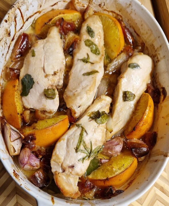 Nu verdeel je de stukken sjalotjes, knoflookteentjes met schil, kipfilets, sinaasappel partjes en dadels.