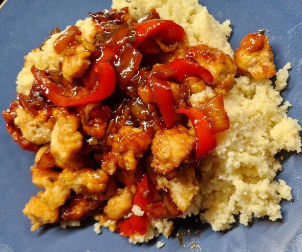 Doe 1 soeplepel zoetzure kip bovenop.