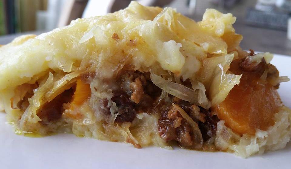 Verdeel de zuurkool op het gehakt-nectarine mengsel.