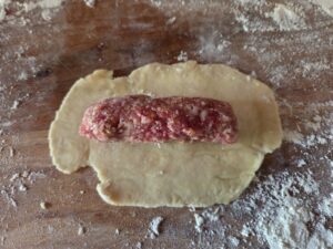 Breng daarna het deeg van voor en achter samen rond het worstje en knijp deze twee kanten stevig tegen elkaar, zodat het broodje goed dicht zit.
