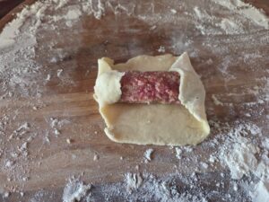 Vouw eerst de zijkanten van het deeg naar binnen, zodat de uiteinden goed afgesloten zijn.